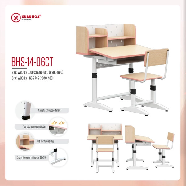 - Tính năng bàn có thể nâng hạ chiều cao cả bàn và ghế với 4 mức tăng chỉnh, với mặt bàn có thể tạo mặt nghiêng 2 cấp độ 15° và 30°.