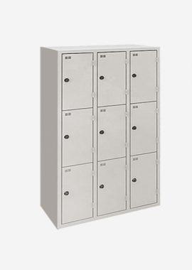 - Tủ bao gồm 9 khoang, 9 khóa riêng biệt. Cánh tủ có núm tay cầm và tai khóa ngoài,