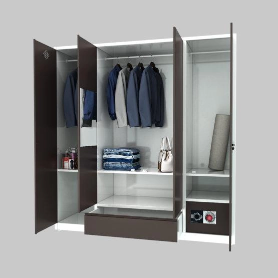 Tủ bao gồm 03 khoang 04 cánh mở và 01 ngăn kéo trượt. Các ngăn đều có ngăn đợt di động và xà treo quần áo, cánh tủ có gương soi, ngăn hộc tủ có khóa mã két an toàn