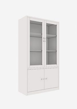 - Tủ gồm 2 khoang. Khoang trên 2 cánh kính mở có khóa, bên trong có 2 đợt di động. Khoang dưới 2 cánh thép có khóa.